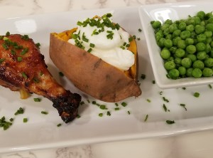 I paired this with baby sweet potatoes topped with fat free sour cream and chives, and a side of peas. Can I give my self a pat on the back? This was SO good and easy! I hope you enjoy it. If you make it, please drop me a line and comment on it.