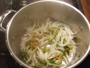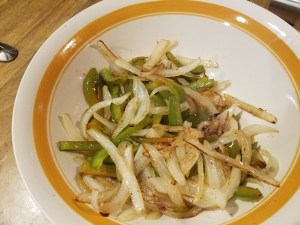 - Add the peppers and onions and sauté until soft and a bit charred (not burnt) (about 5 minutes)