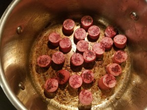 - Cut the turkey sausage into bit size slices (hint: if the sausage is too soft to cut easy, put it in the freezer for 10 minutes and it will then be easier to cut)