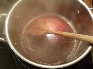 - Put the pot back on the stove and deglaze the pan with the wine (that’s where the goodies are) and scrape up the bottom of the pan with a flat spoon