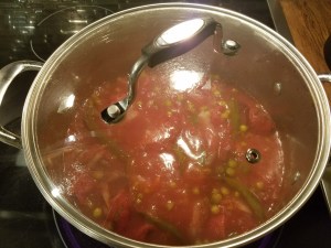 - Add the stewed tomatoes to the pan and with the flat spoon break them up a bit