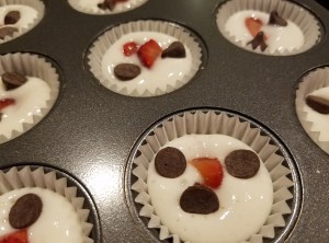 - Add a piece of strawberry and a few chocolate chips to each cup cake