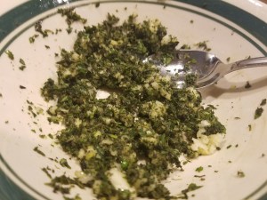 - Mince the garlic and add it to the herbs and set aside