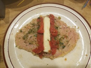 - Dredge the chicken in the egg then the breadcrumbs (hint – roll it in the breadcrumbs the same direction the chicken is rolled so it stays together)