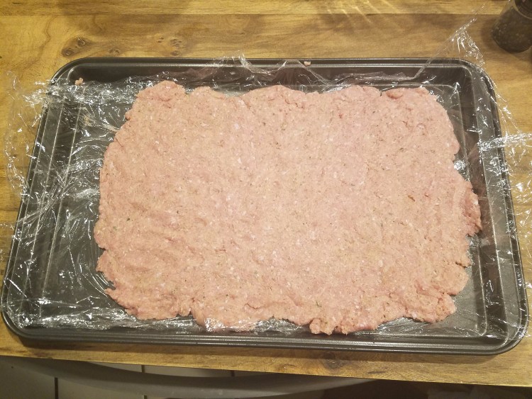 - Spread the ground turkey over the plastic wrap from end to end, and press down for an even layer.