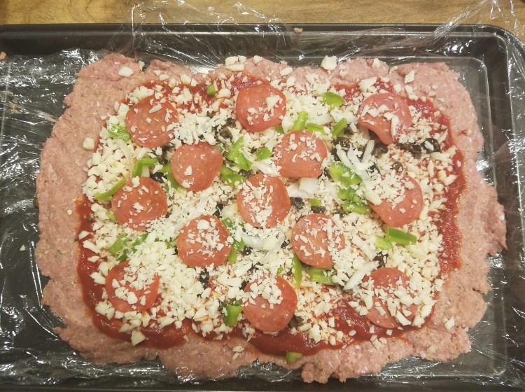 I have to admit that I’m a food show junkie. I watch every food show from Food Network to Rachael Ray. I love to learn new recipes and techniques. I got this idea from watching a Rachael Ray episode. I love her show! She made a turkey rolled meatloaf, but I’m in the mood for pizza – so I changed filling. This just shows that recipes are nothing more than suggestions. You can change the ingredients to whatever you feel like making (and whatever you already have it in the pantry). This also shows that recipes can be altered to be less calories and less fat. It’s as simple as getting smart ingredients (like low fat or low sodium). And let me just put this out there – I need pizza and I need it now!