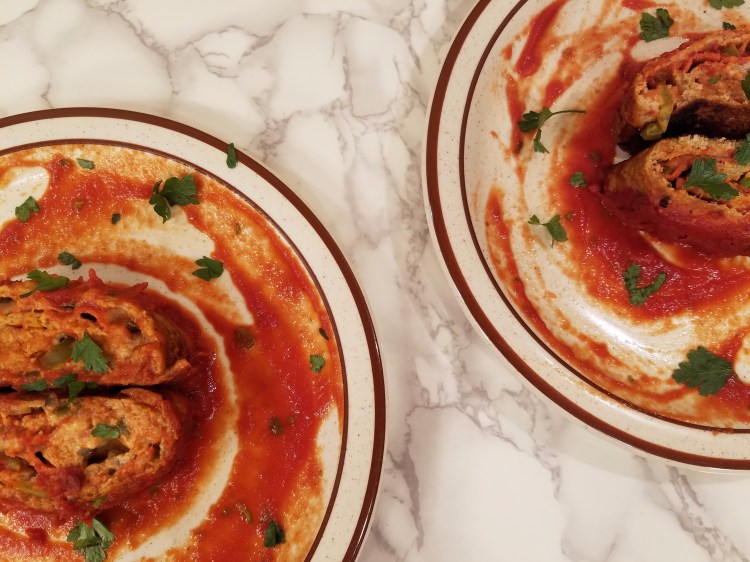 For plating, I took some of the sauce and spread it on the dish in a circular motion (like you do on a round pizza), then cut the rolled turkey pizza into 2 inch slices and placed 2 slices per plate and top with fresh parsley. I paired this with a simple salad and homemade salad dressing. Delish! Did I mention I love pizza?