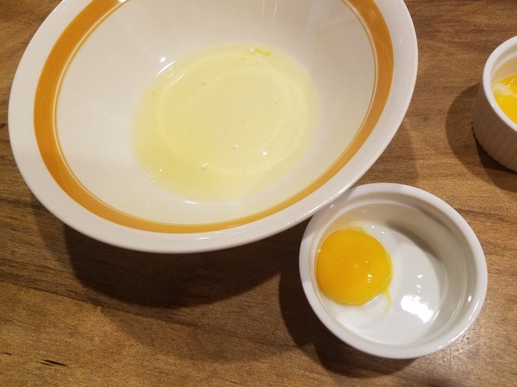 - Separate egg yolk from egg white (crack egg, open egg over a large bowl, move the yolk from one side of the shell to the other several times until all the whites fall into the bowl)