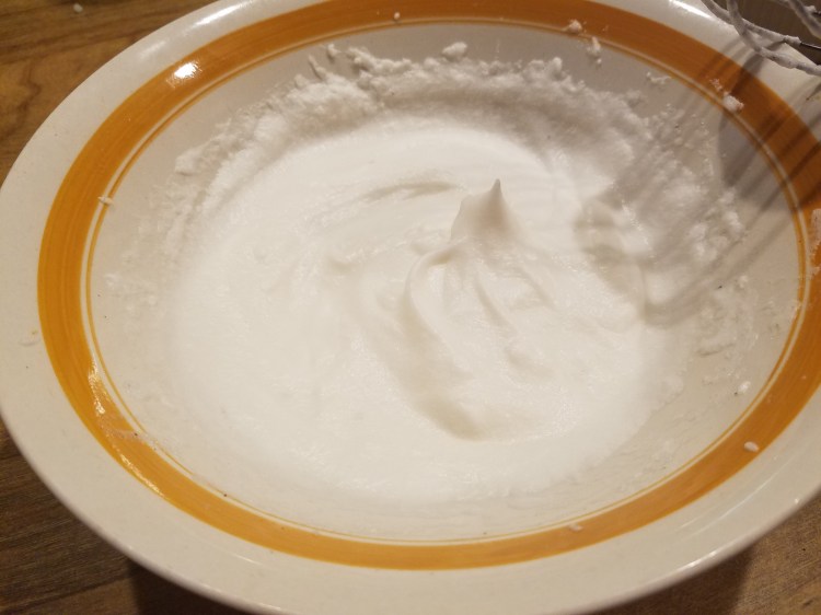 - Using a whisk, whisk the egg whites until you see stiff peaks (this takes a few minutes. You might want to have a cup of coffee while you’re doing this to keep your strength up.)