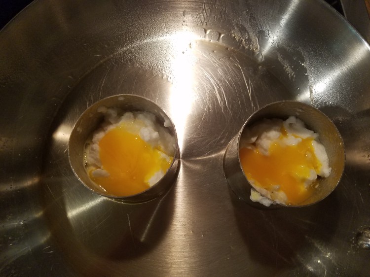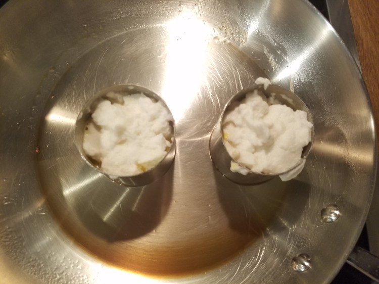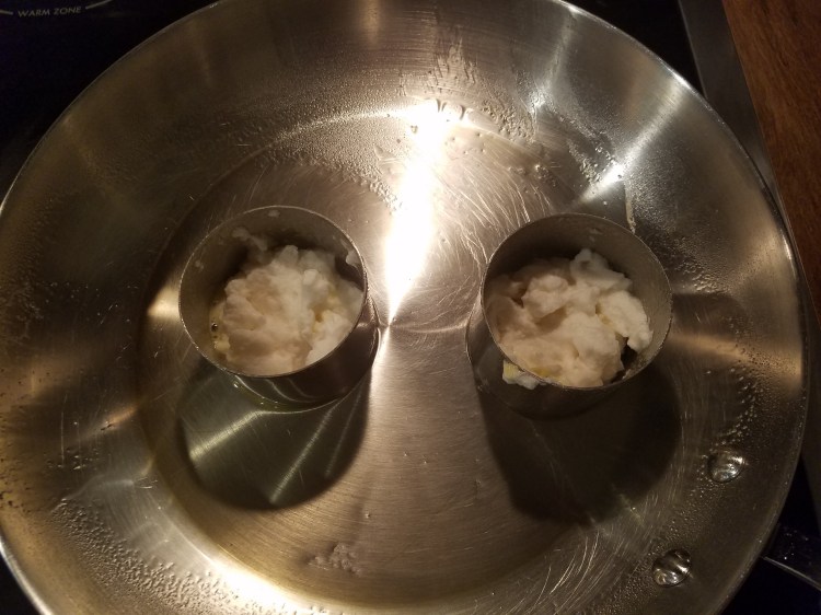 - Put the round molds in the fry pan and spray with cooking spray (use a lot of spray)