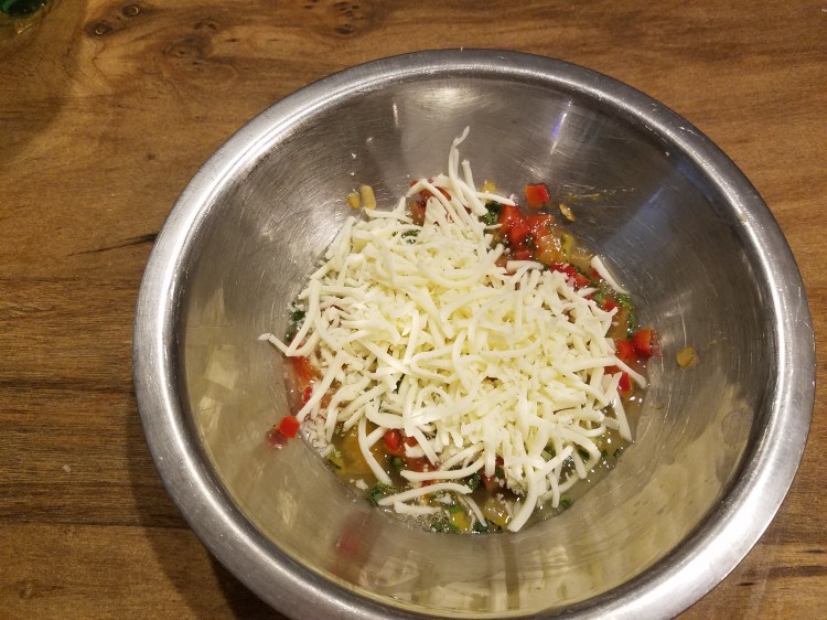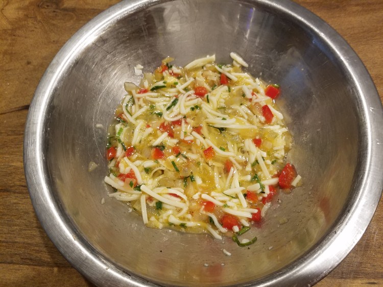 - In the whites’ bowl, fold in the herbs, sautéed veggies, and cheese. Do not use a whisk.