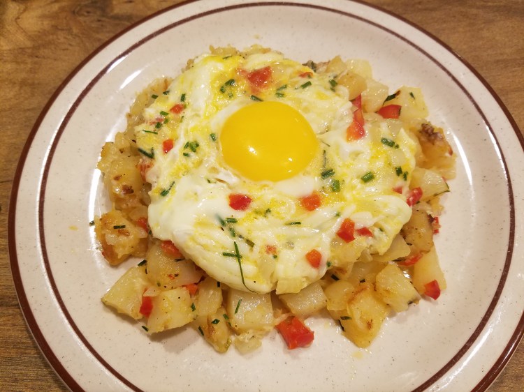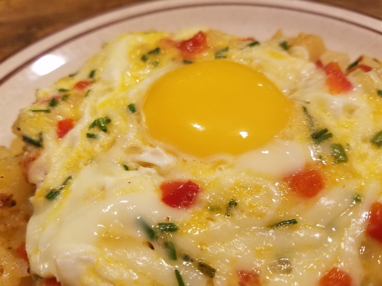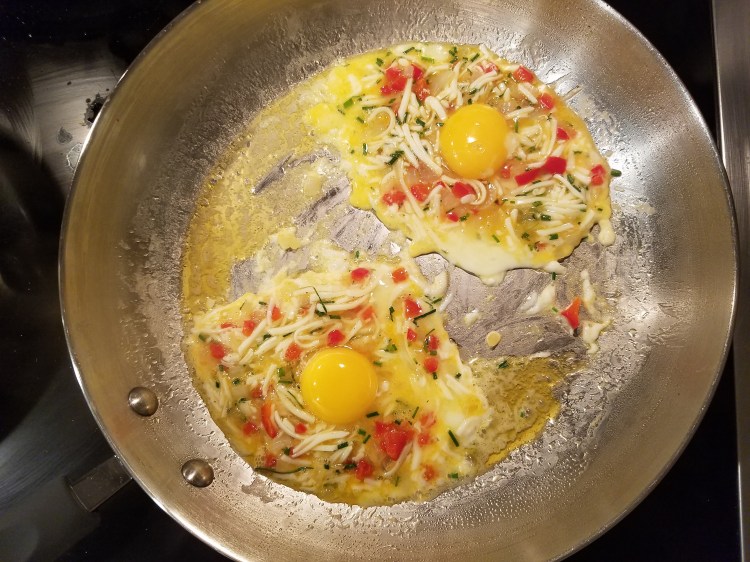 When you think herbs, veggies, cheese and eggs, you think omelette, right? Well, I’m not that big of a fan of omelettes, but I do love sunny side up eggs. The ooey gooeyness of a runny golden egg yolk makes me happy. So, this is a combo of the best of both worlds. This is a versatile recipe that you can change the ingredients using the same prep and cooking style. So, grab whatever you have in the fridge and make this!