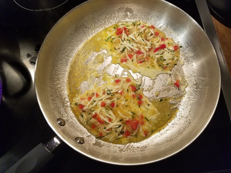 - Dice up an onion and pepper and saute them in a little I Can’t Believe It’s Not Butter over medium heat, about 3-5 minutes