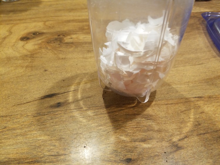 Then, when you use eggs, rinse the shells and put them in a microwave safe bowl. Microwave them on high for 2 minutes. Let them cool, then place them in a blender or a bullet blender, and blend them into almost a powder for 30 seconds. If you don’t have a blender, you can put the shells in a plastic bag. Take the air out of the bag and seal it. Then crush the shells by rolling a rolling pin or a can over the bag.