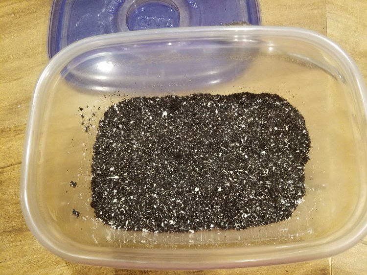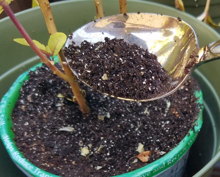 Add the crushed or powder shells to the coffee grounds and mix. And that’s it. You have fertilizer. Cover them until you’re ready to use. They will keep for at least a week, but I’m not sure after that because I have a lot of herb plants and I use all my fertilizer weekly.