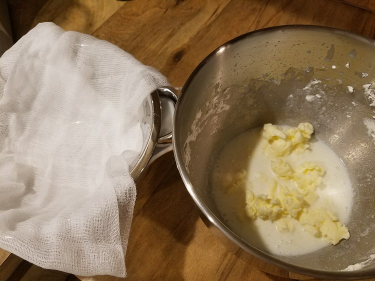 - Put a cheesecloth lined colander into a bowl and pour the butter and buttermilk into the colander