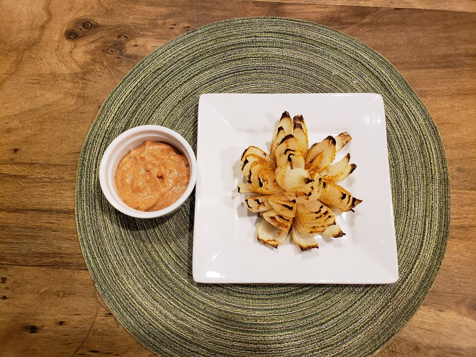 Take the outer paper off an onion. Cut the top off, but leave the bottom on. Cut into wedges without cutting the bottom so it stays intact. Gently open up the onion wedges. Sprinkle with spices and then spray the onion with cooking spray. Bake at 400 for 20 minutes. In the meantime, mix mayo and ketchup with the same spices for a dipping sauce.