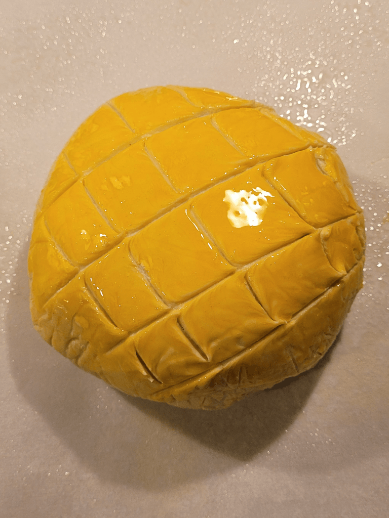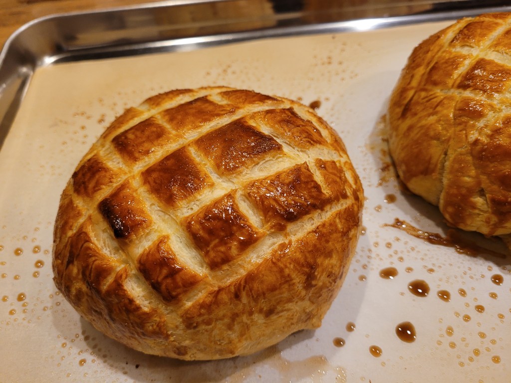 - Scramble 1 egg yoke and brush the yoke over the puff pastry.