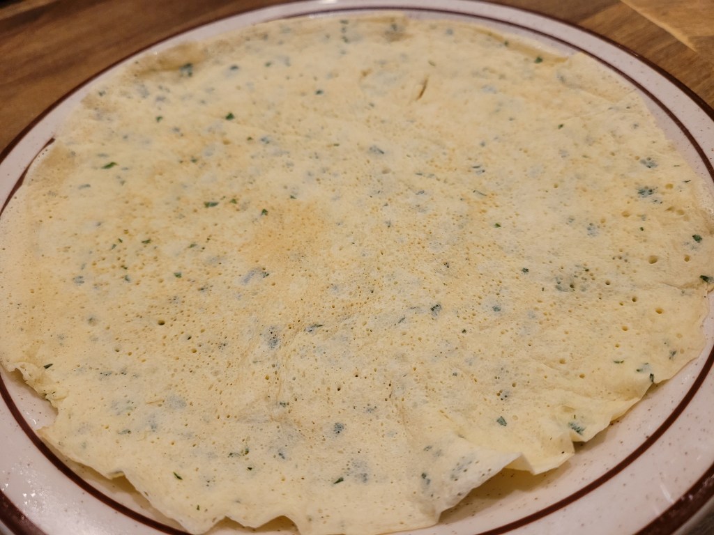 Note: Most recipes use chives, but I never have that in the house and I always have parsley, so I use parsley. You can experiment with all kinds of soft fresh herbs, whatever you have on hand. I would not use a hard herb like rosemary for the crepes.
