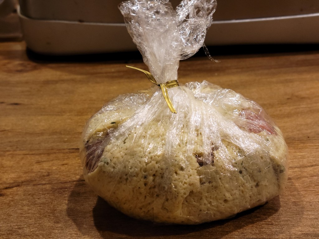 - Roll them into the plastic wrap, towards the end, into a round shape.