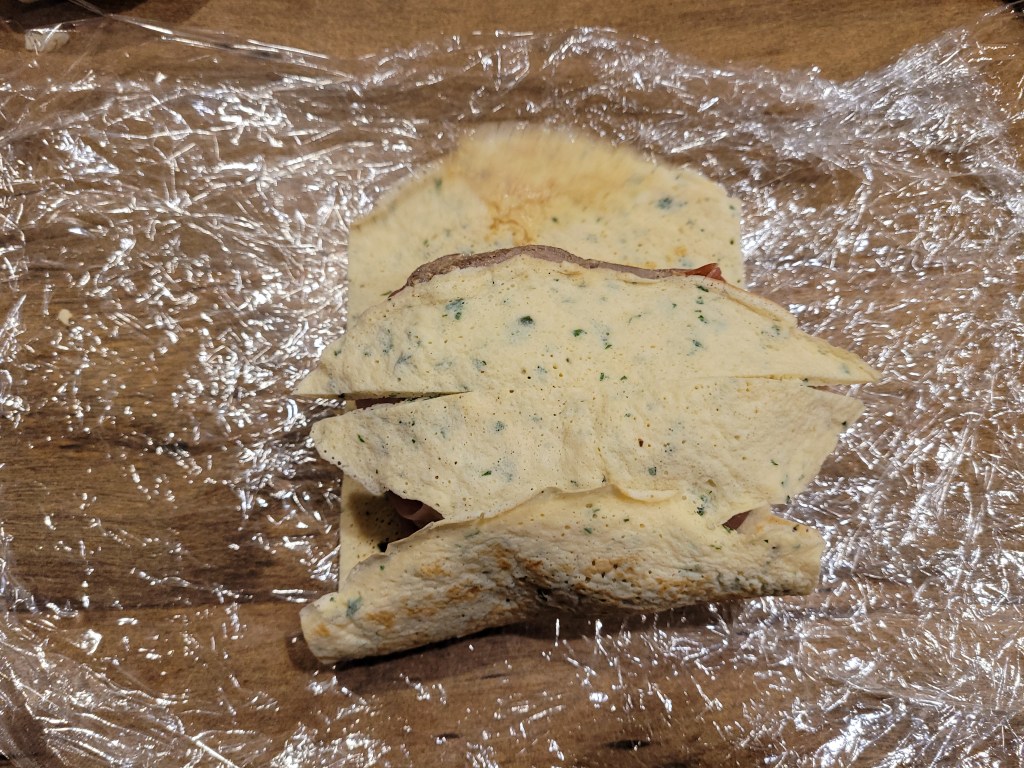 - Lay 1 crepe, then 2 prosciuttos (over lapping them) on top of the crepe.