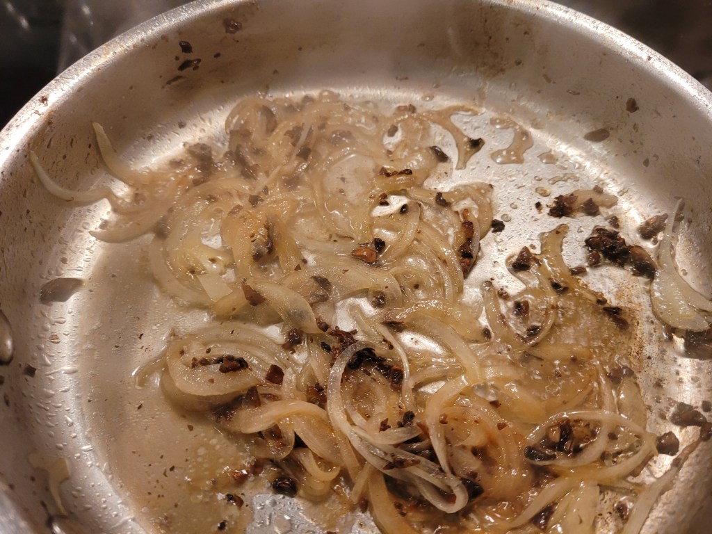 - Add thinly sliced onions to the pan with a pinch of salt.