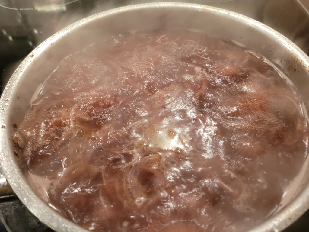 While the Wellingtons are baking, make the red wine dipping sauce. In the same pan you used for the steaks and mushrooms, heat oil and add thinly sliced onions to the pan with a pinch of salt. Saute for a few minutes, then add wine and stock (beef, chicken or veggie stock). Scrape up all the bits at the bottom of the pan. Bring to a strong simmer and reduce by half.