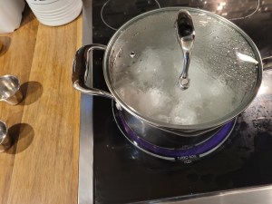 - Fill the pot with water enough to cover the eggs and an extra inch above and bring it to a boil.