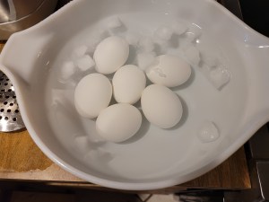 - With a slotted spoon, remove the eggs and shock them in a bowl of ice water.