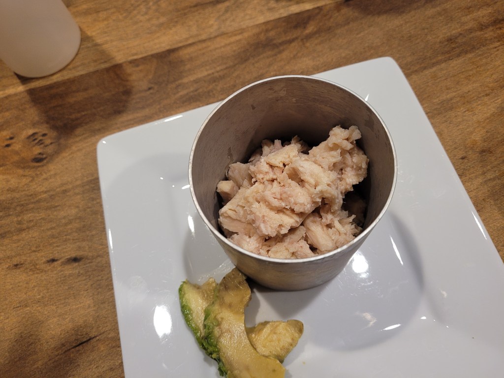 Place a cookie cutter or mold on a plate (preferably round or you can use the tuna can if you open both sides). Add the tuna to the bottom of the mold and tamp it down (using anything small enough to fit in the mold like a squeeze bottle).