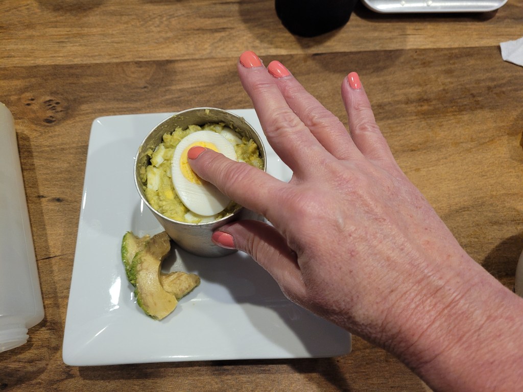 Reserving a spoonful of avocado, add the avocado to the mold and tamp down. Then slice one of the eggs. Reserve one slice and cut up the rest. Add the cut up portion of the egg to the reserved avocado and mix. Add a pinch of salt then add that to the mold and tamp down. Top the mold with the slice of egg. Lightly pushing down on the egg slice and remove the mold by sliding it up.