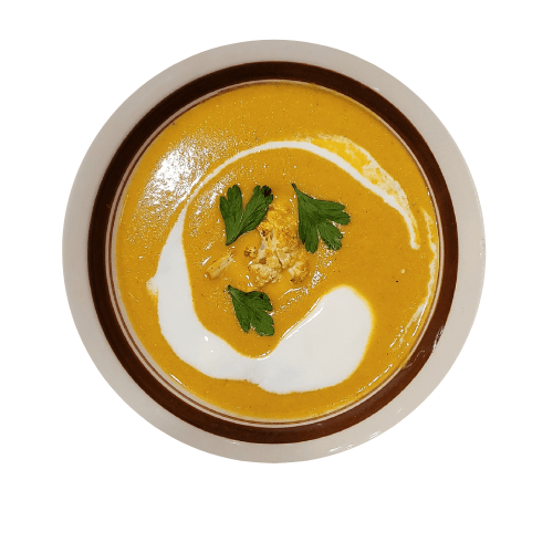 - Scoops the soup into a bowl. Place one of the cauliflower florets and a few parsley leaves on top as a garnish