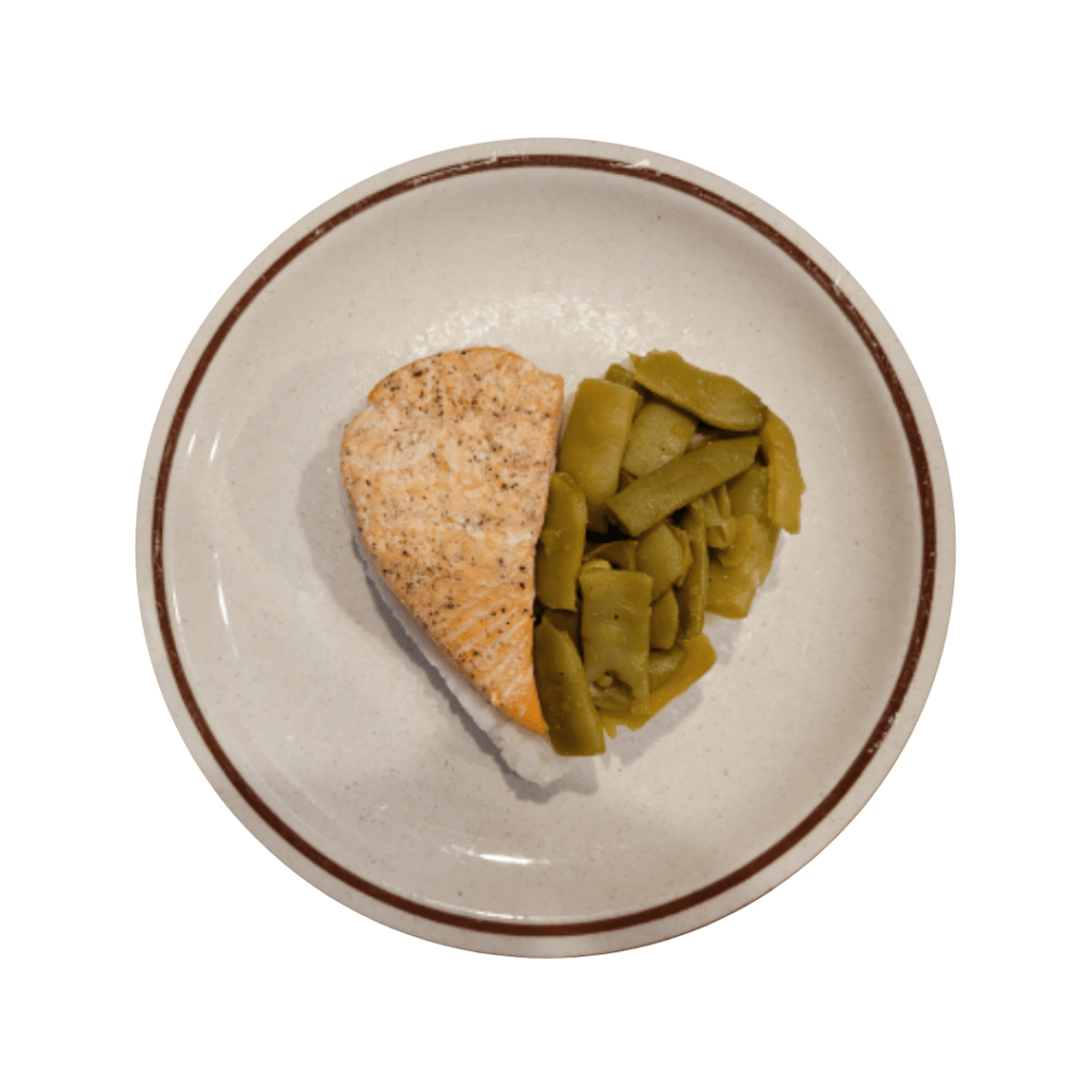 Then after I washed the cookie cutter, I placed it on a plate. Filled it with rice, then placed half of a heart-shaped Salmon and filled the rest of the heart with the green beans. Removed the cookie cutter, repeat for my dish, and served warm.