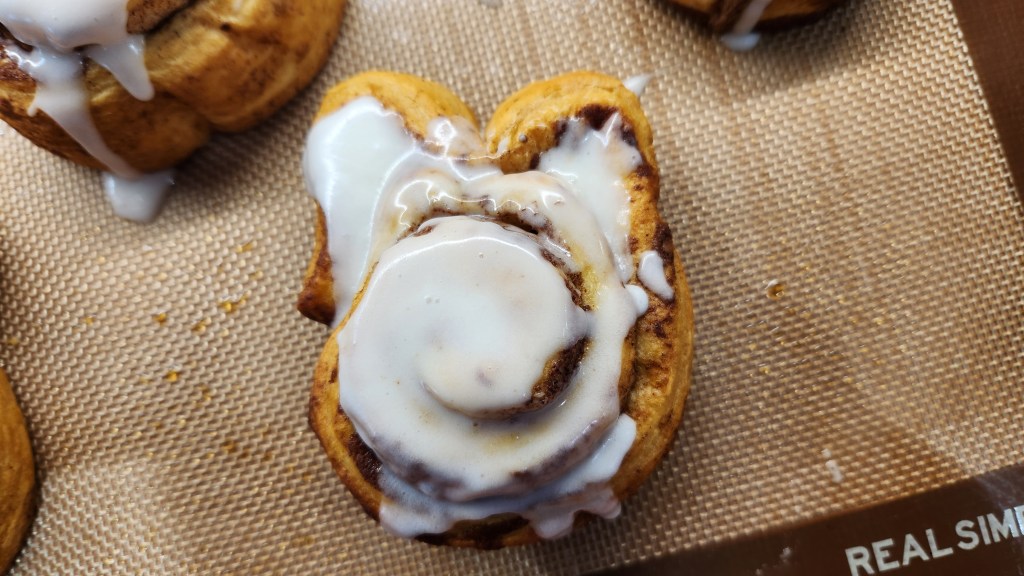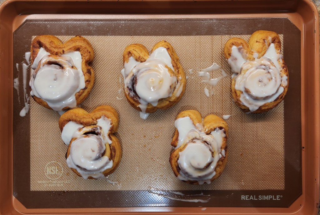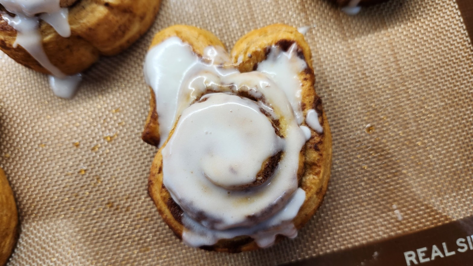 Unroll some of the outer cinnamon roll, shape the top into ears. Pinch the end to the round part of the roll. Bake as directed. Reshape if needed, then top with icing.